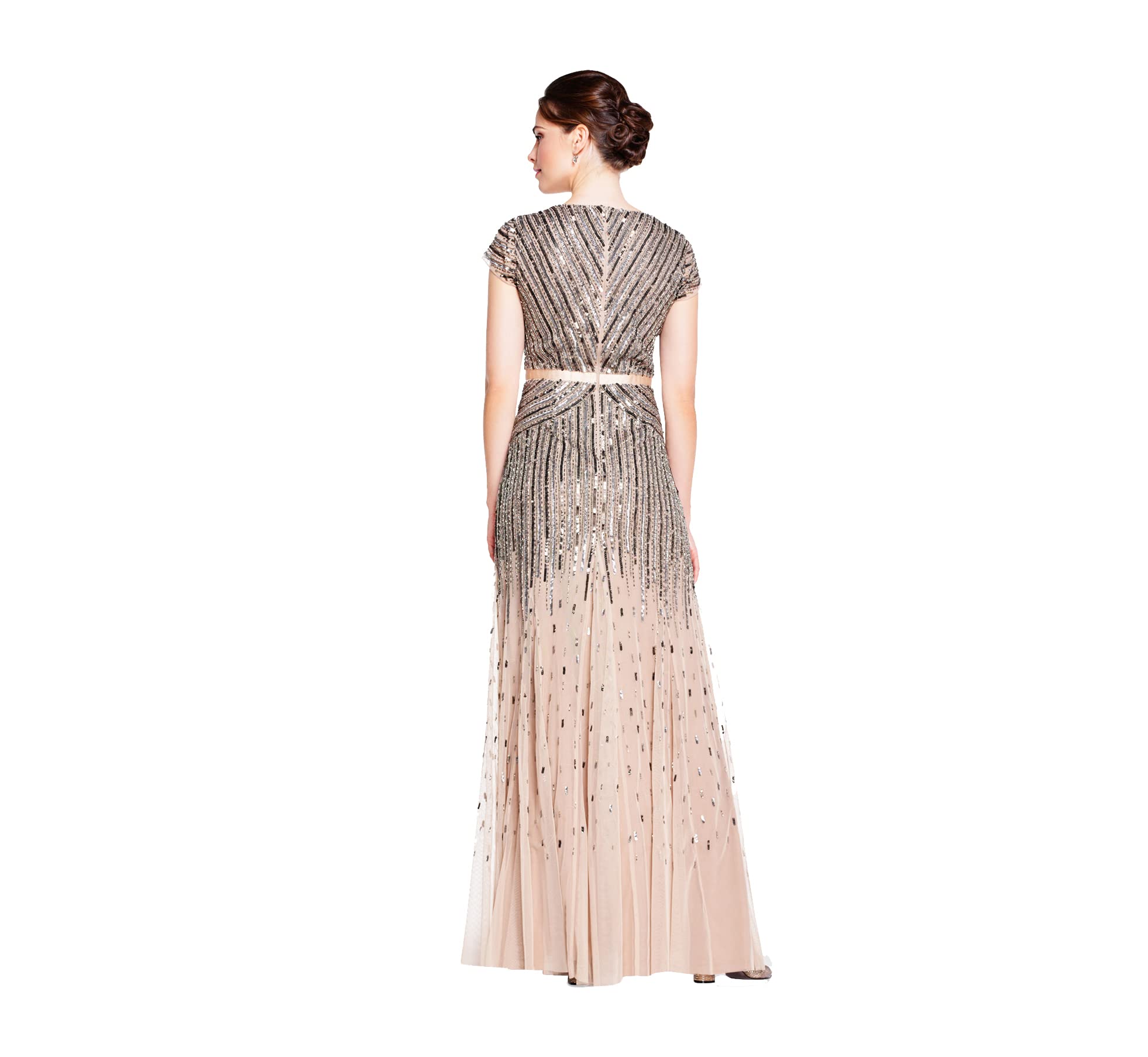 Cassis Women's Long Beaded V-Neck Dress with Cap Sleeves and Waistband - Adrianna Papell