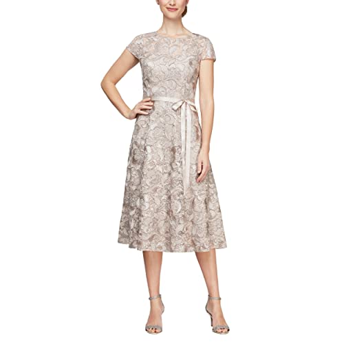 Champagne Women's Tea Length Dress with Rosette Detail Petite and Regular - Alex Evenings