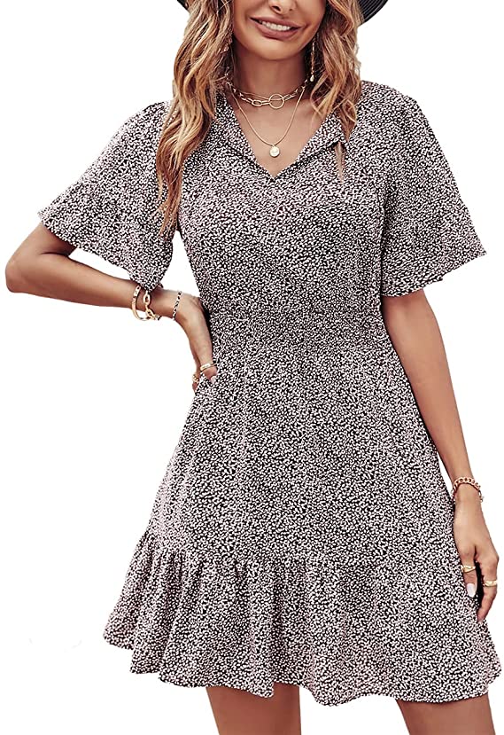 - 1.Features:Tie Neck/ Elastic Waist/Hem pleated/Loose Fit/Knee Length/Ruffles Short Sleeve/Floral Print Dresses/Casual Style/Lightweight and Breathable/Boho Floral Printed/Skin-Friendly/Summer Dresses/ Comfortable Inner Lining/Fashion Style/V-Neck/High Waist/Chic And Classic/So Cute/Stretchy/Holiday Vacation/