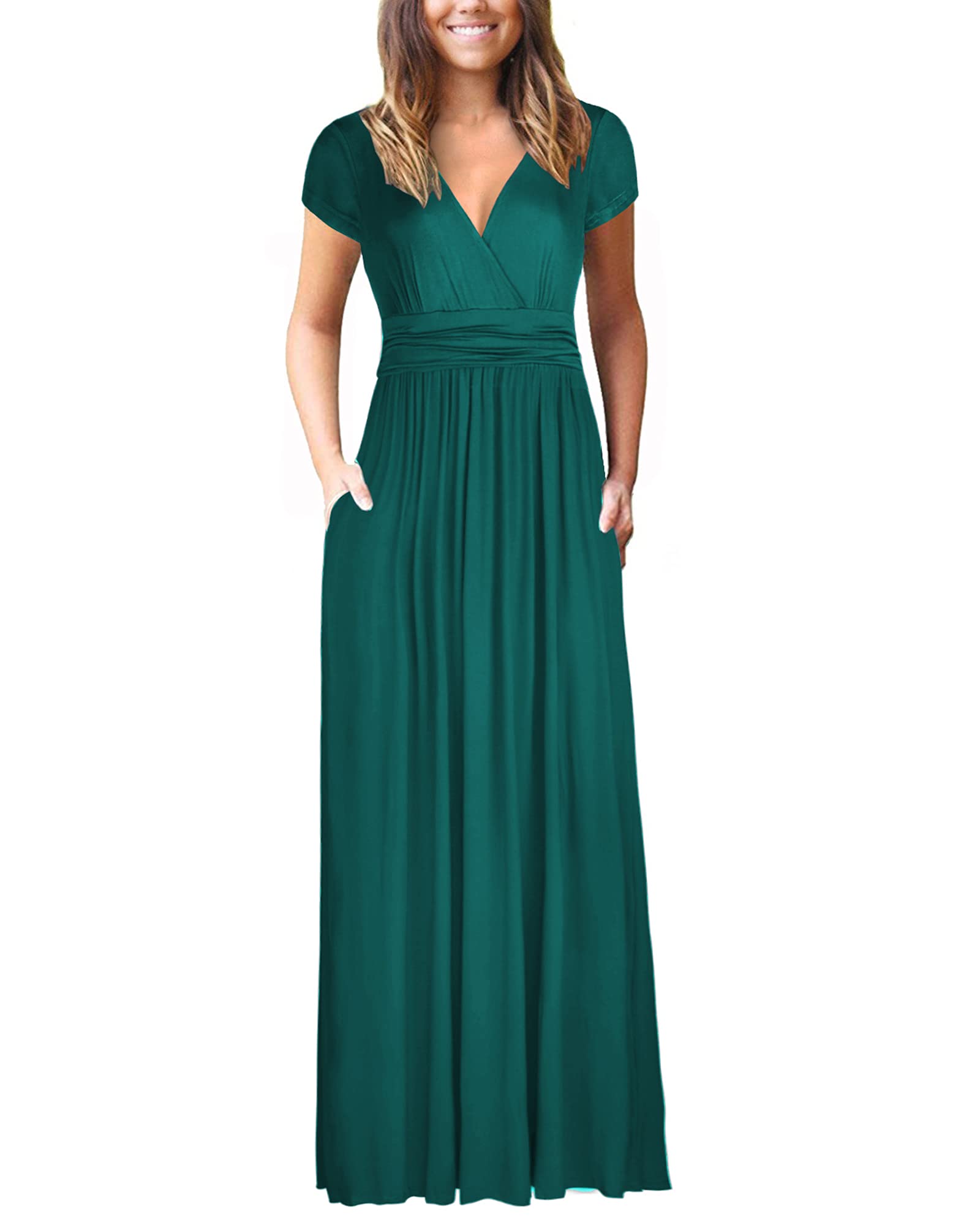 Dark Green Ladies Summer Casual V Neck Short Long Sleeve Floral Pattern Wrap Ladies Maxi Long Dress with Pockets - OUGES