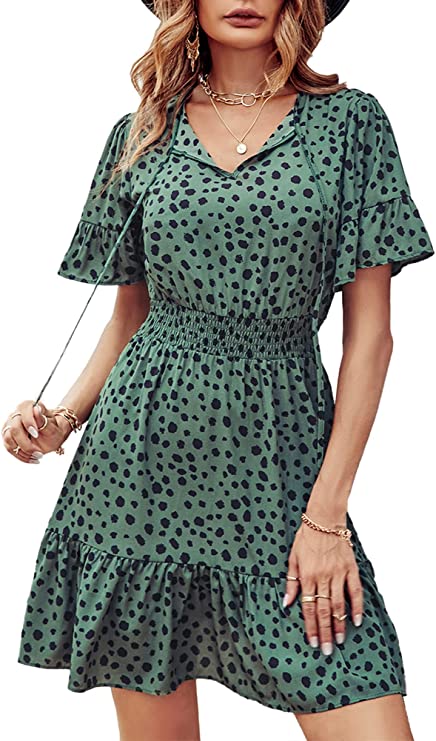 Dark Green Leopard Women's Summer Boho Short Dresses Floral Print Tie Neck Short Sleeve Elastic High Waist Ruffle Mini Skater Dress - Prettygarden