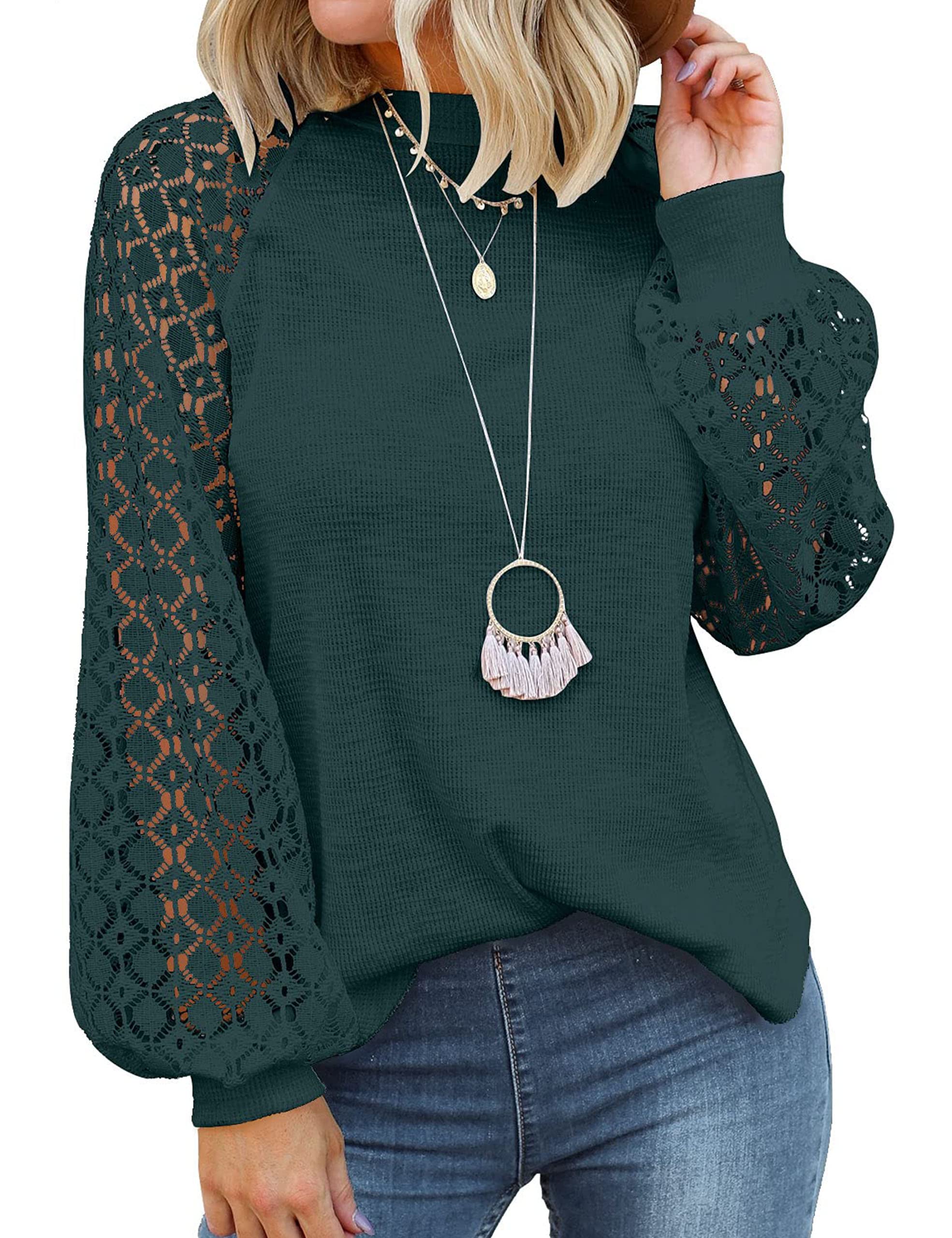 Dark Green Women’s Long Sleeve Tops Lace Casual Loose Blouses T Shirts - MIHOLL