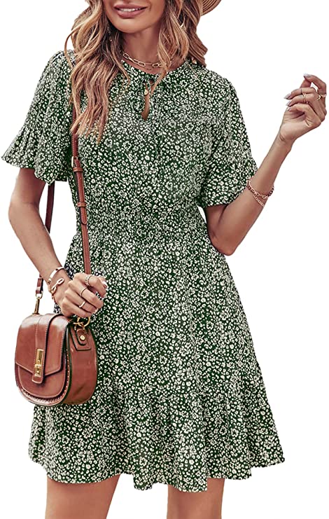 Dark Green Women's Summer Boho Short Dresses Floral Print Tie Neck Short Sleeve Elastic High Waist Ruffle Mini Skater Dress - Prettygarden