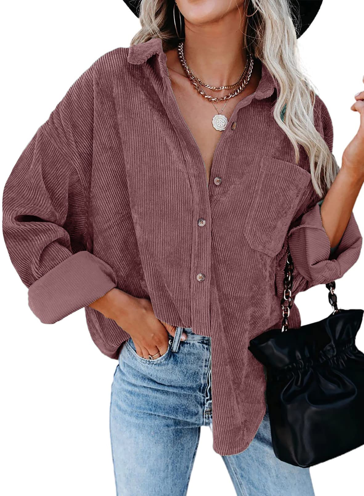 Dark Pink Womens Corduroy Button Down Shirts Boyfriend Long Sleeve Ove – Original Brand