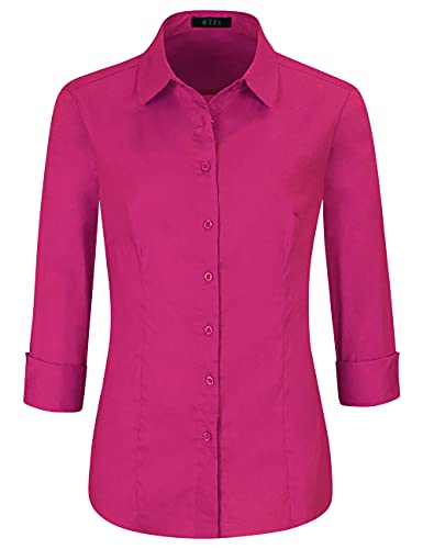 Deep Pink Womens Slim-Fit Long Sleeve Stretchy Button Down Collar Office Formal Casual Shirt Blouse - EZEN