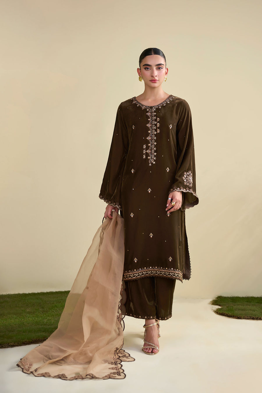 With its exquisite design, premium materials, and impeccable craftsmanship, the Dhanak FW25DA-2821 Brown Velvet Suit is the perfect choice for brides who want to look and feel their best on their Velvet Muse Pret. It is a timeless piece that will be cherished for years to come.