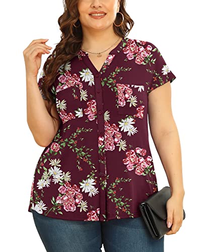F Wine Red Women's Plus Size Short Sleeve Shirt Button Down V Neck Tops Casual Blouses with Procket - TIANZHU