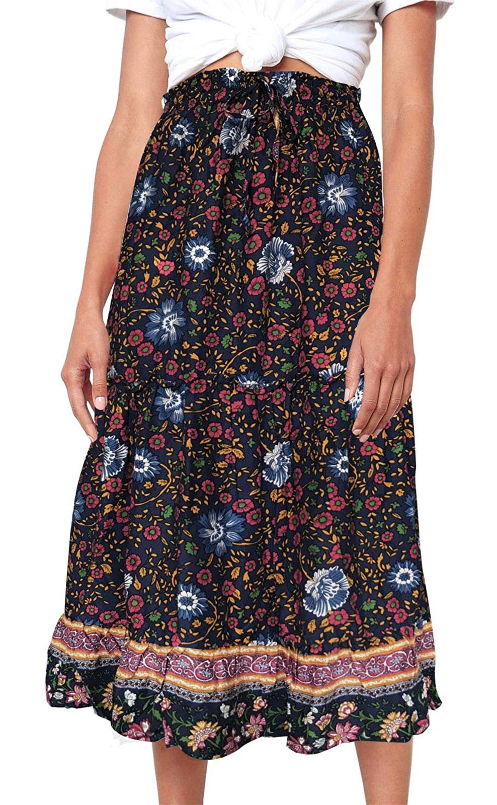 Floral Navy Women's Bohemian Floral Printed Elastic Waist A Line Maxi Skirt with Pockets - ZESICA