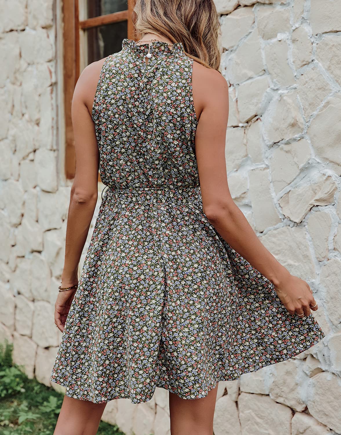 Floral Print Dark Green Women Floral Dresses Casual Summer Sleeveless Halter Neck Ruffle Belt Boho Polka Dot Leopard Print Sun Short Dress - BTFBM