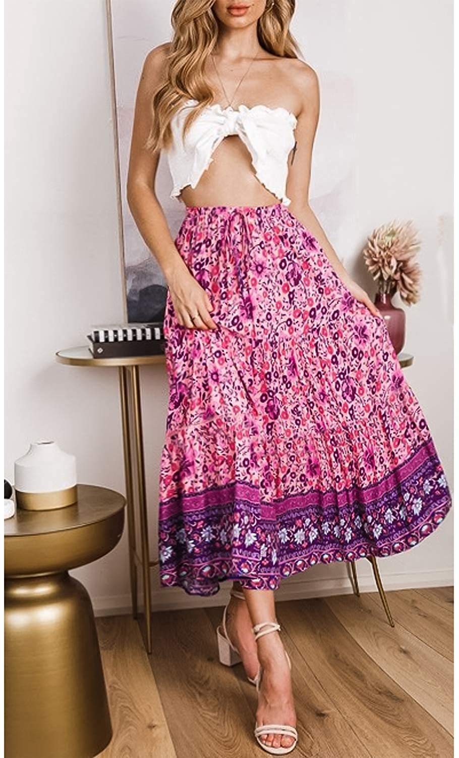 Floral Purple Women's Bohemian Floral Printed Elastic Waist A Line Maxi Skirt with Pockets - ZESICA