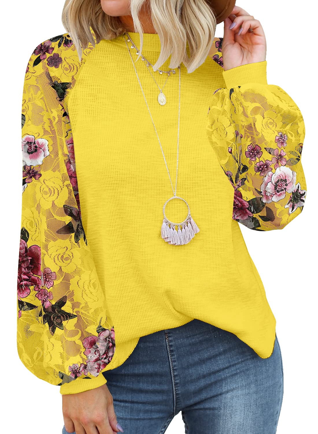 Floral Yellow Women’s Long Sleeve Tops Lace Casual Loose Blouses T Shi – Original Brand