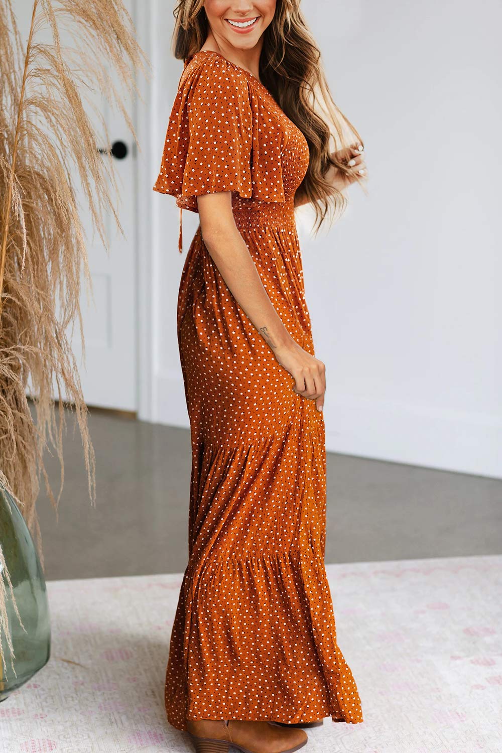 - Features: Machine Washable! Stun this season with the most requested Maxi dress! These Solid Maxi dresses features very delicate details:Flutter Sleeve,Round-neck,Smocking at bust and waist(smocked Fathered elastic bodice), ruffle on hem,beautiful Solid color,Skirt is pleated,Easy and Comfortable fit. Apparently,the flutter sleeve, and smocking detail,self-tie/keyhole on back add such a pretty detail on this basic maxi.
