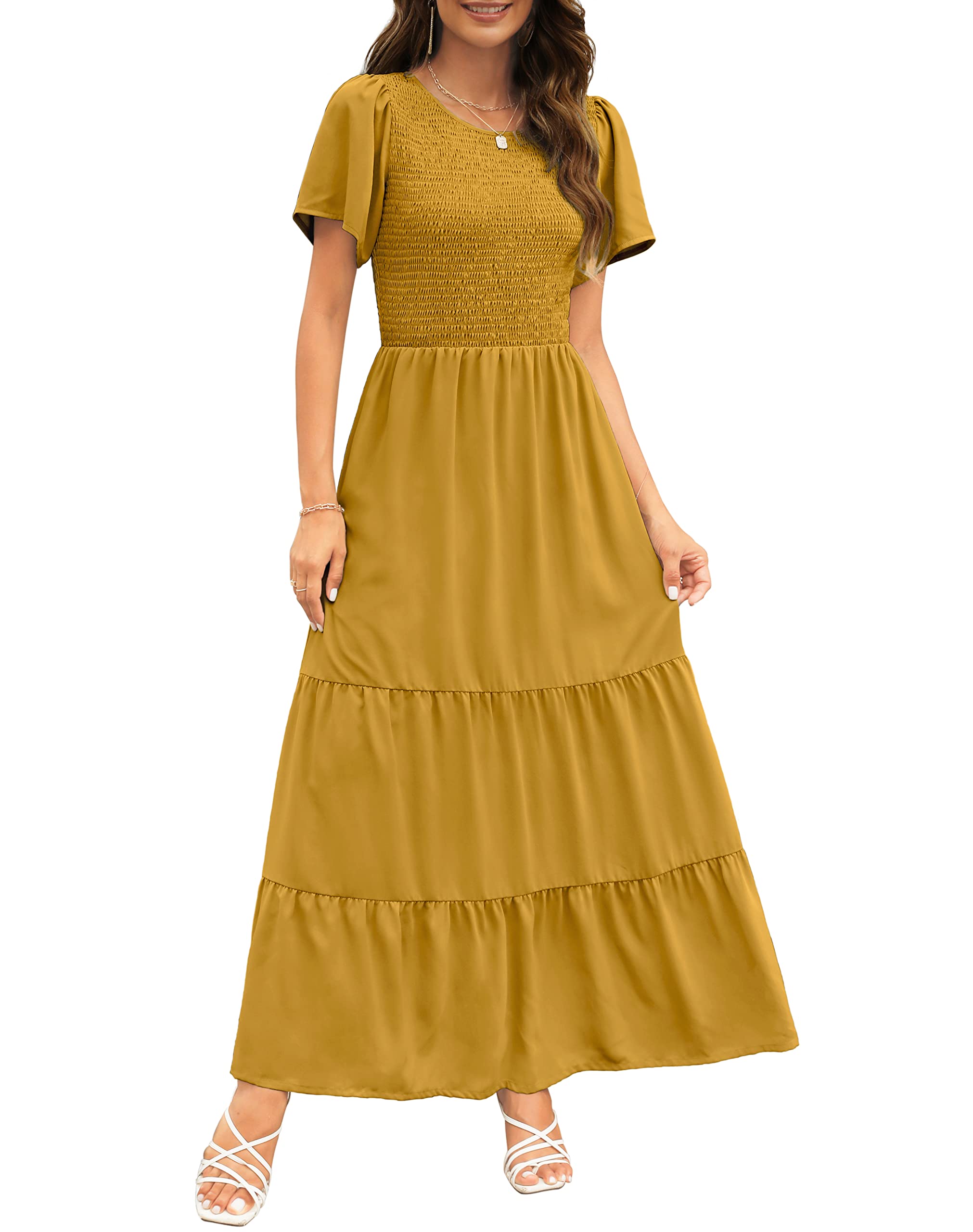 - Style: ?We couldn't love these classic Solid color dresses more. The shape is so flattering and we owe it all to the full elastic bodice. The flutter sleeve, and smocking detail,self-tie/keyhole on back add such a pretty detail on this basic maxi. Plus this makes it extra comfortable. As for the material, it's soft,comfortable friendly to your skin,perfect for Spring,Summer and Fall days!