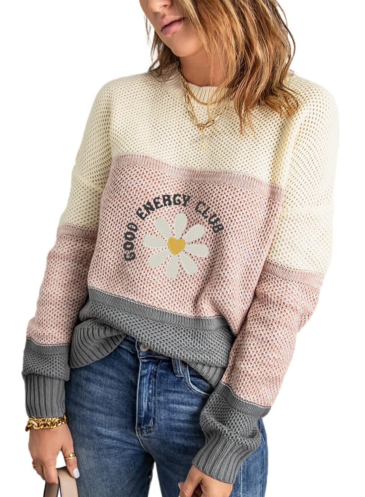 Gray Energy Good Womens Color Block Sweaters Long Sleeve Crewneck Pullover Knit Jumper Tops - Dokotoo