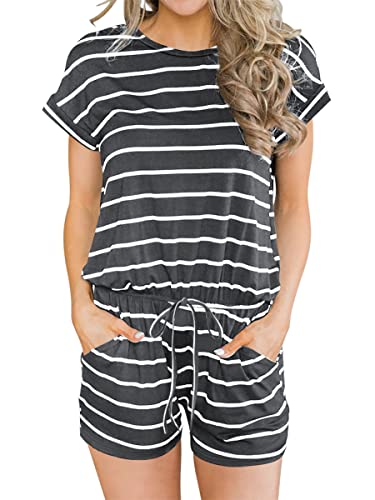 Gray White Stirpes Summer Crewneck Casual Loose Short Sleeve Jumpsuit Rompers One Piece Pajamas Loungewear with Pockets - ANRABESS