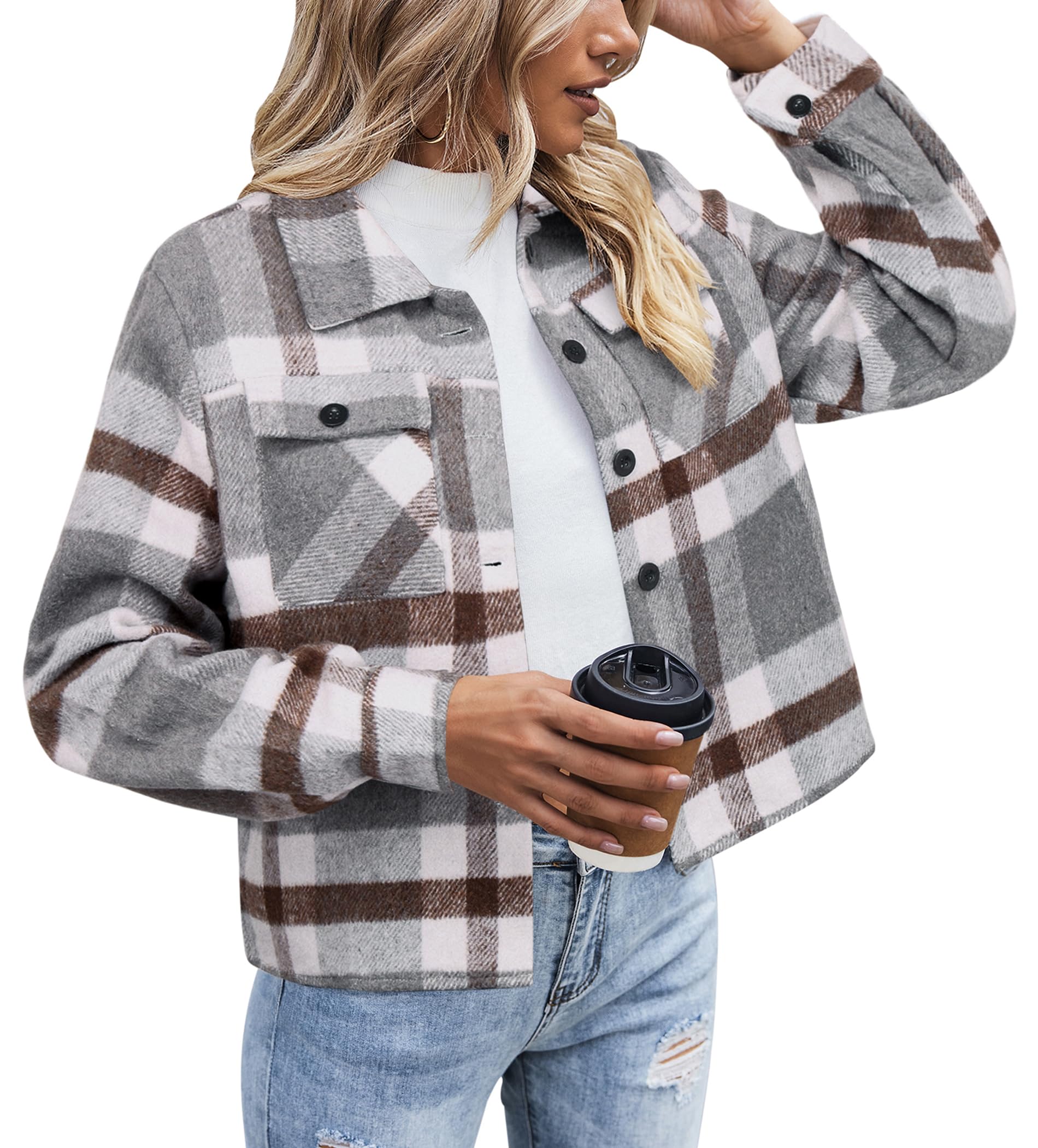 Gray Women Shacket Jacket Plaid Button Down Shirt Fall Coat - Zeagoo
