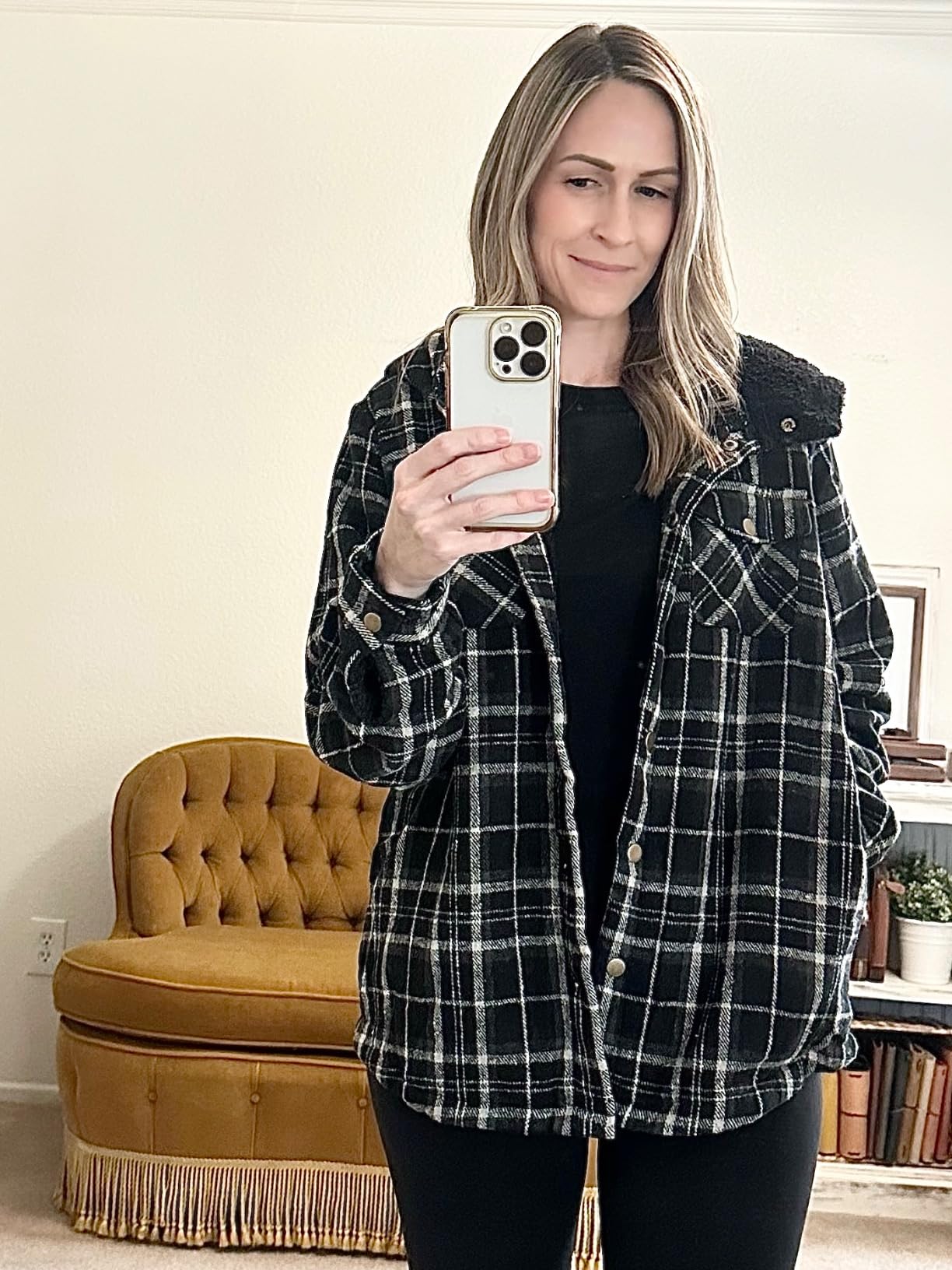 Gray Womens Black Fleece Jacket Plaid Shacket Long Sleeve Button Down - Dokotoo