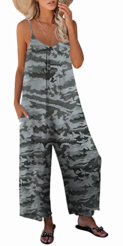 Green Camouflage Casual Sleeveless Strap Loose Adjustable Jumpsuits Stretchy Long Pants Romper with Pockets - SNUGWIND