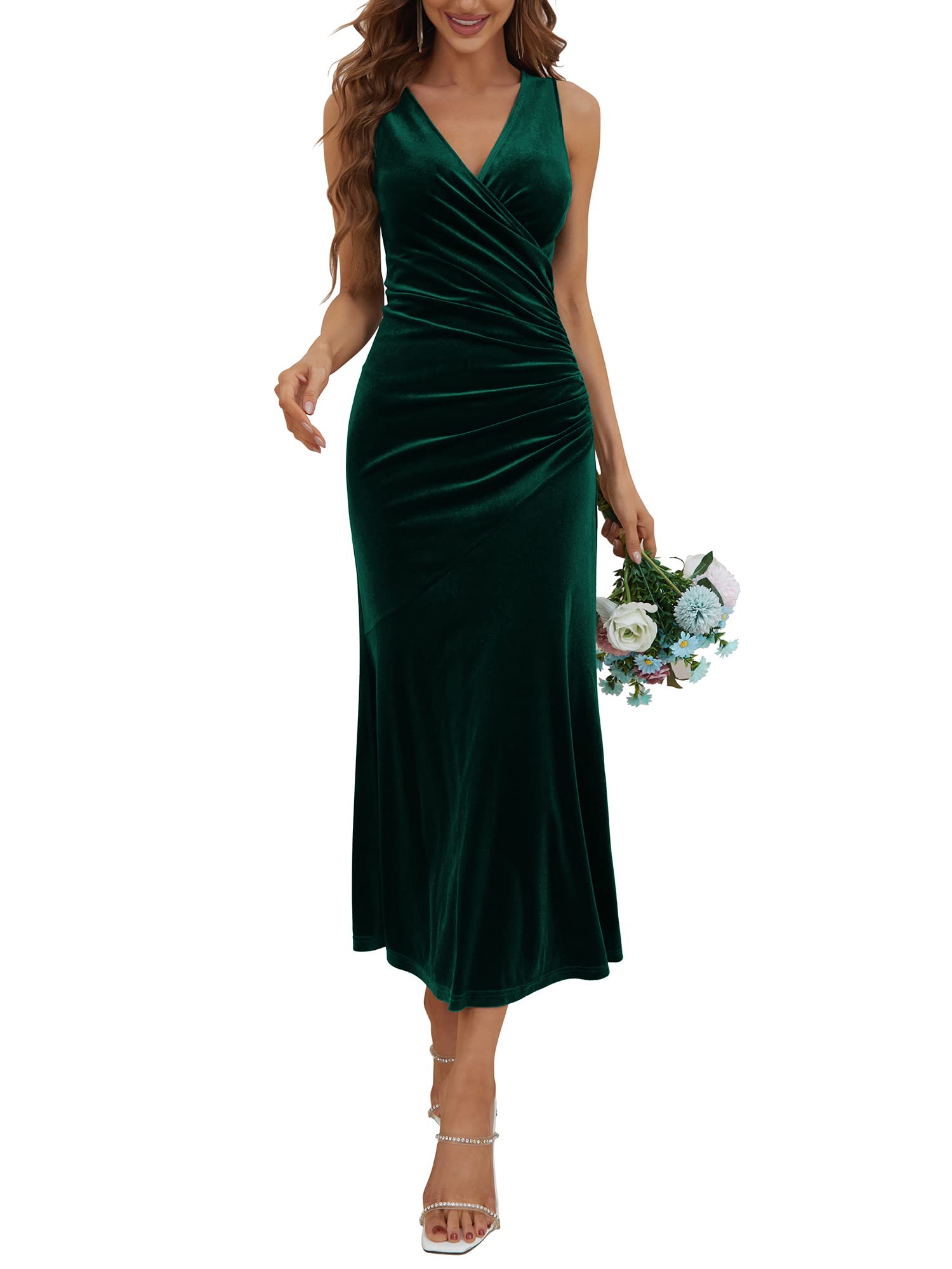 Green Tank Dress Women's V Neck Wrap Long Sleeve Elegant Mermaid Velvet Cocktail Maxi Dress Evening Party - ZABERRY