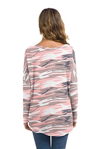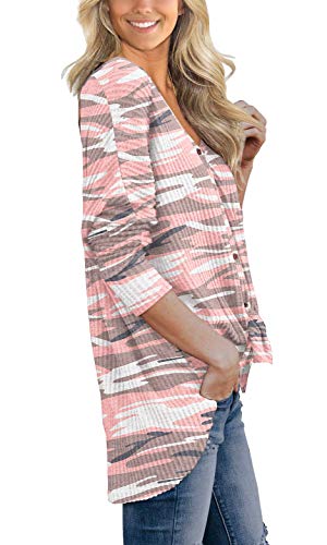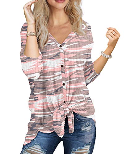 IWOLLENCE Womens Loose Henley Blouse Bat Wing Long Sleeve Button Down T Shirts Tie Front Knot Tops Pink Camo Medium