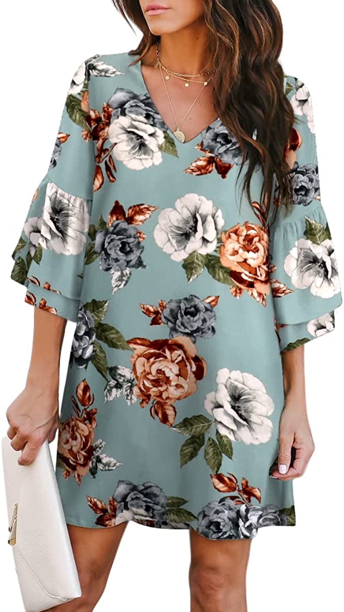 Lake Blue Peony Women's Dress Sweet & Cute V-Neck Bell Sleeve Shift Dress Mini Dress - BELONGSCI