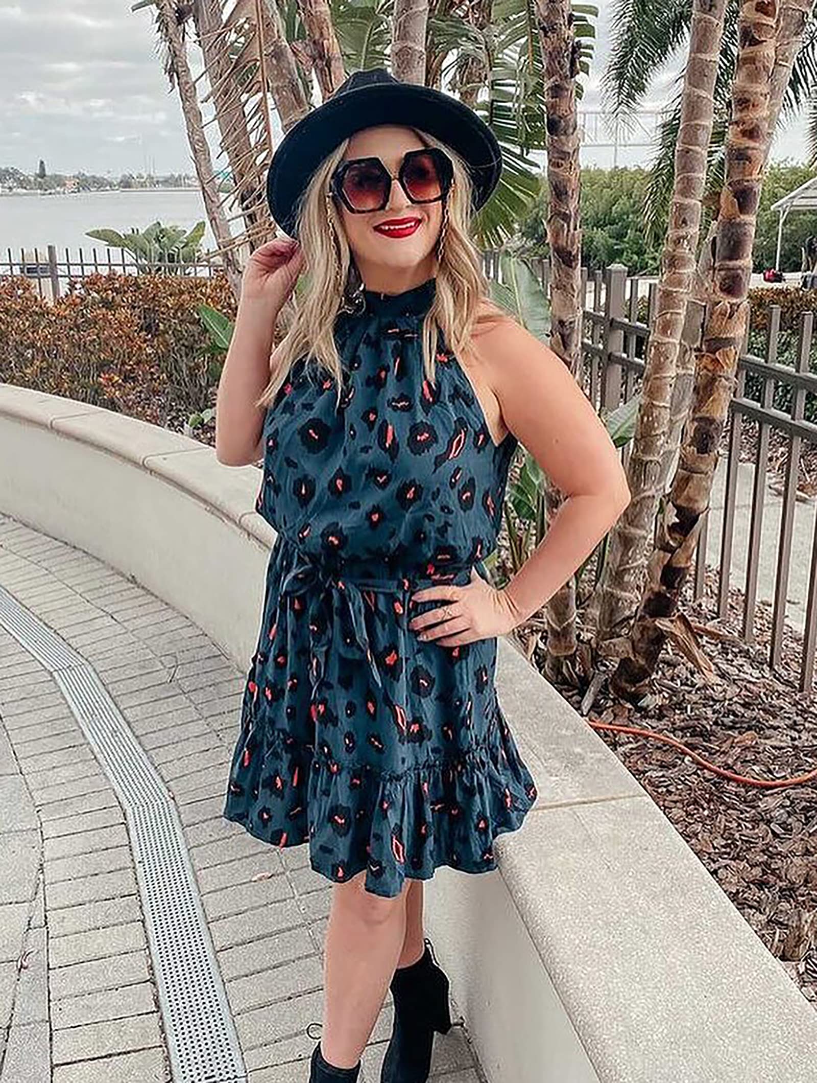 Leopard Dark Green Women Floral Dresses Casual Summer Sleeveless Halter Neck Ruffle Belt Boho Polka Dot Leopard Print Sun Short Dress - BTFBM