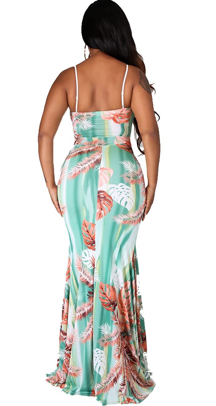 Light Green Women's Summer Floral Spaghetti Strap Maxi Dresses Sexy V-Neck Beach Boho Tropical Long Sundress - HannahZone