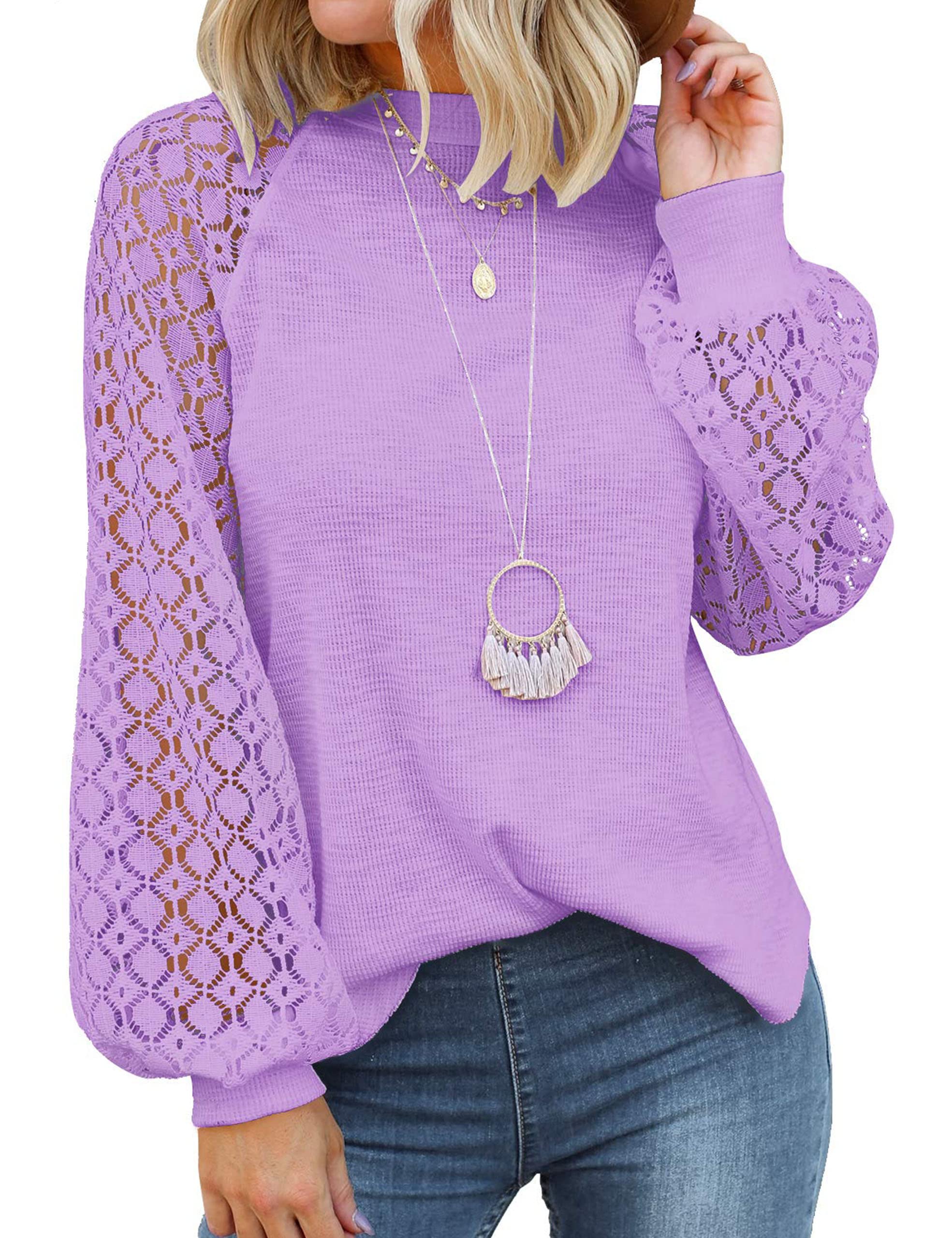 Light Purple Women’s Long Sleeve Tops Lace Casual Loose Blouses T Shirts - MIHOLL