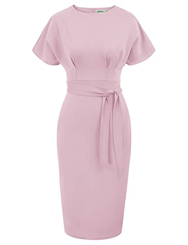 DESIGN: Short sleeve, With belt-fitted loops, matched belt is removable, Two open side-seam pockets(Please note printed color have no pockets), Hips-wrapped silhouette, Scoop neck, Slim fit, Solid color, Knee-length pencil dress. High waist pencil dress with zipper in the back, easy to get on and off.