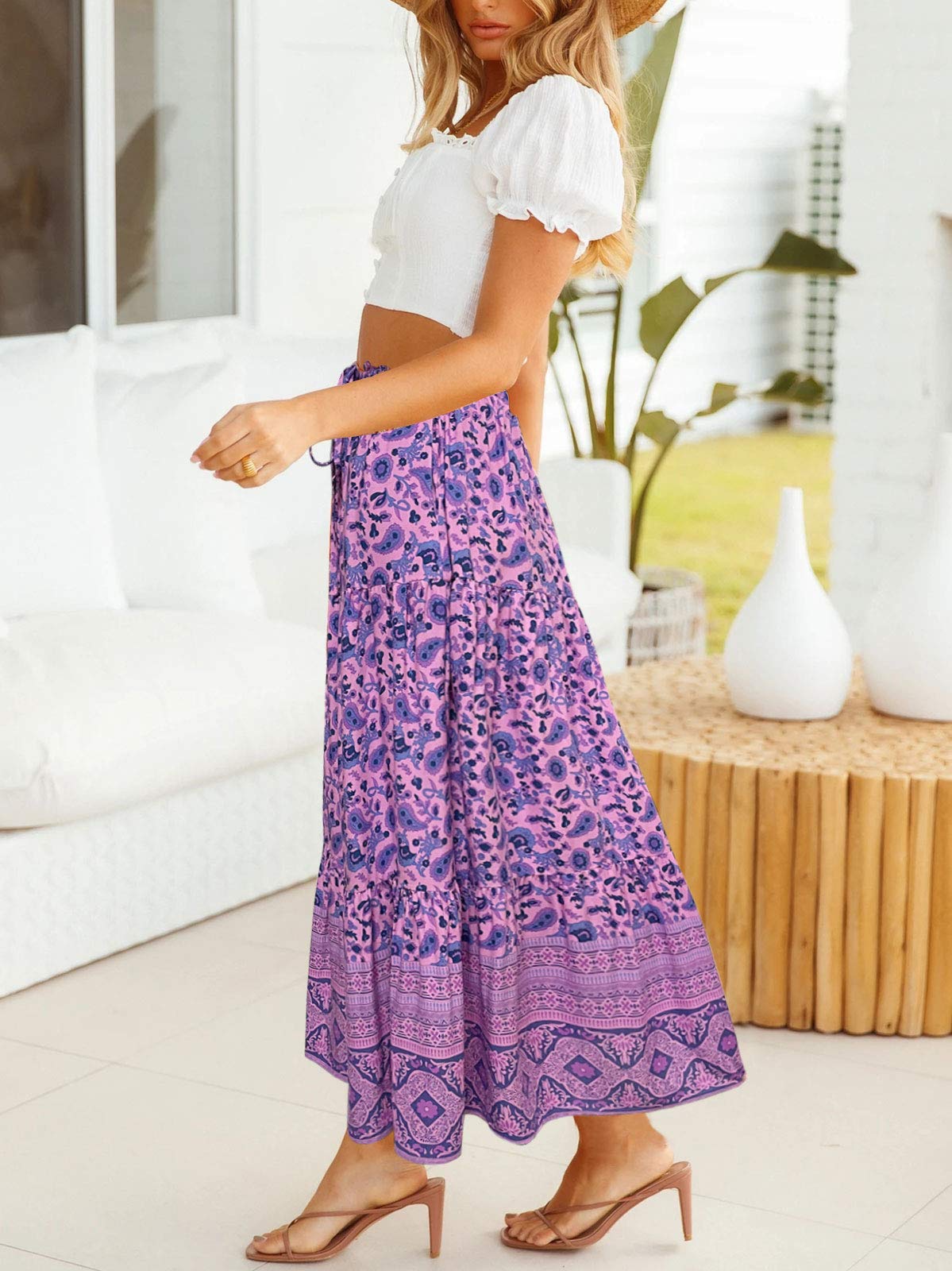 Lightpurple Women's Bohemian Floral Printed Elastic Waist A Line Maxi Skirt with Pockets - ZESICA