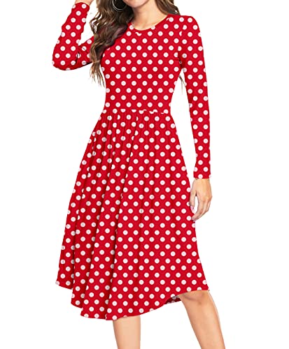 Long Sleeve Red Summer Polka Dot Casual Midi Tunic Short/Long Sleeve Plain Dress Pleated Loose Flowy Floral Ladies Dress with Pocket - YUNDAI