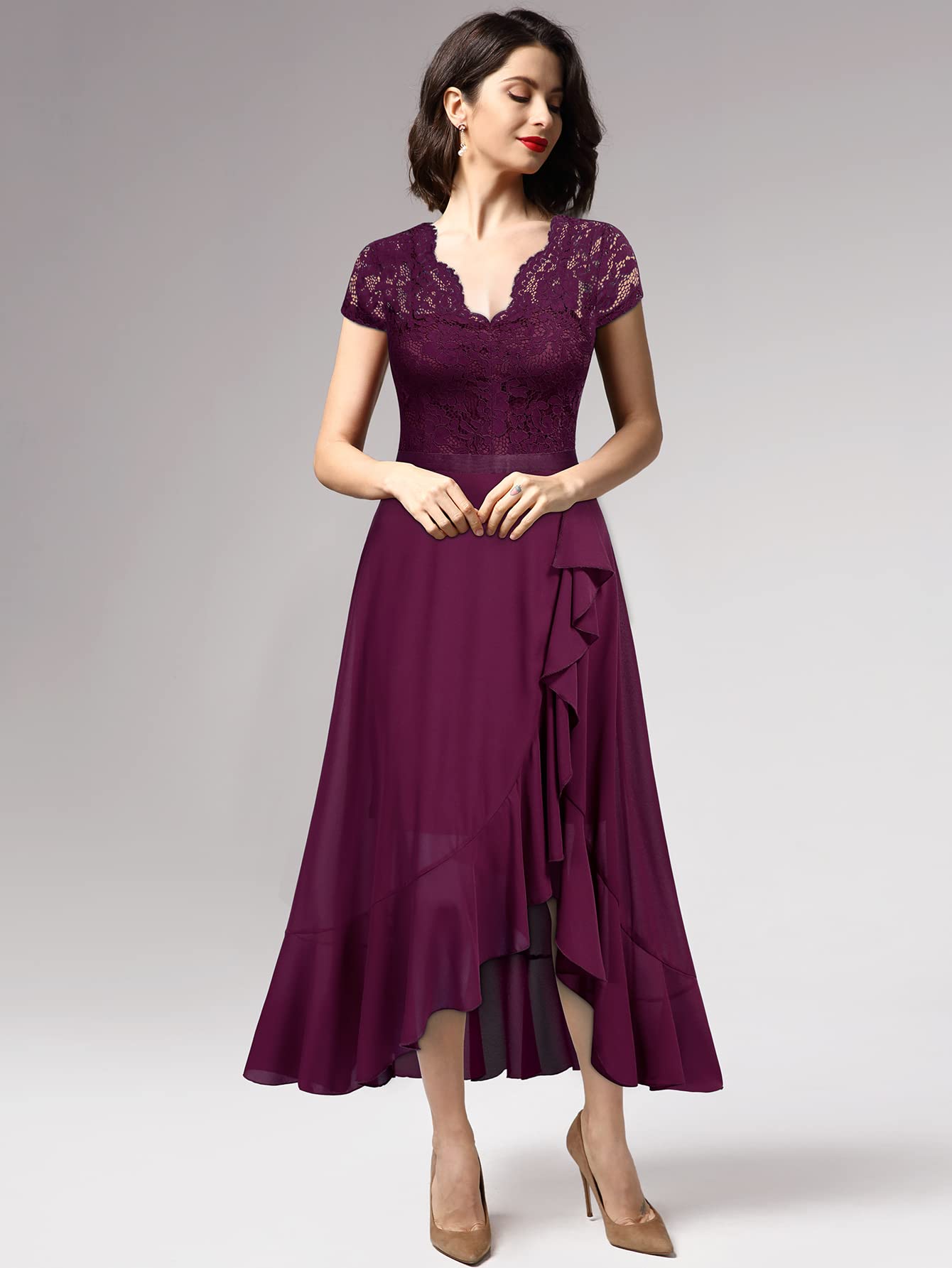 Magenta Ladies Retro V-Neck Lace Ruffle Design Formal Party Maxi Dress – Original Brand