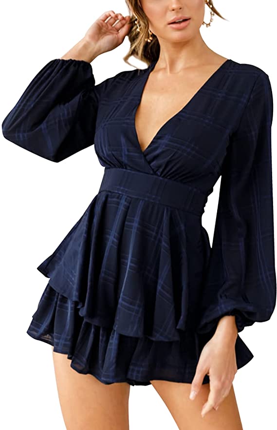 Navy Blue 2 Women's Jumpsuit Floral Print V Neck Baggy Sleeve Waist Tie Double Layer Ruffle Hem Short Mini Dress Romper - Relipop