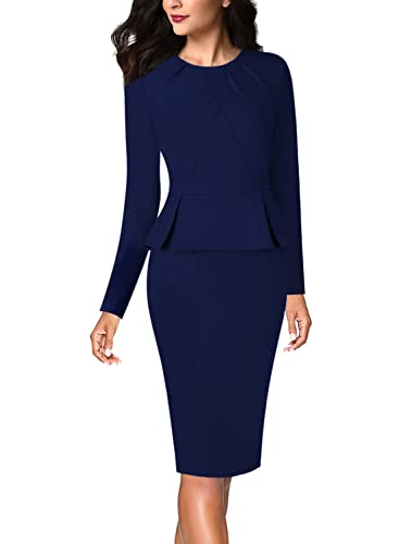Navy Blue Long Sleeve Womens Pleated Crew Neck Peplum Wear To Work Office Sheath Dress Vfshow