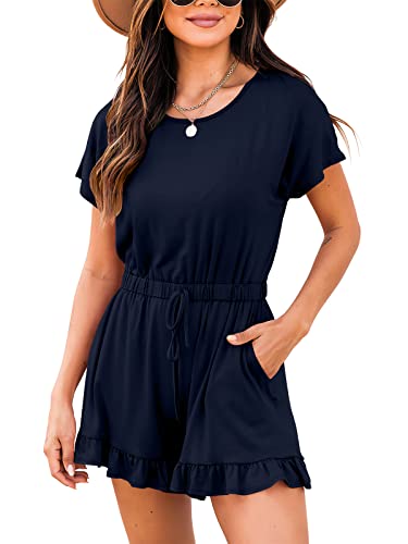 Navy Blue Summer Crewneck Casual Loose Short Sleeve Jumpsuit Rompers One Piece Pajamas Loungewear with Pockets - ANRABESS