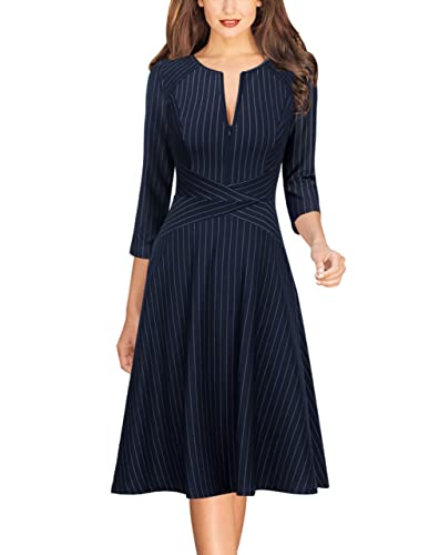 Navy Blue White Stripes Womens Elegant Front Zipper Slim Work Business Office Party Cocktail A-line Dress Vfshow
