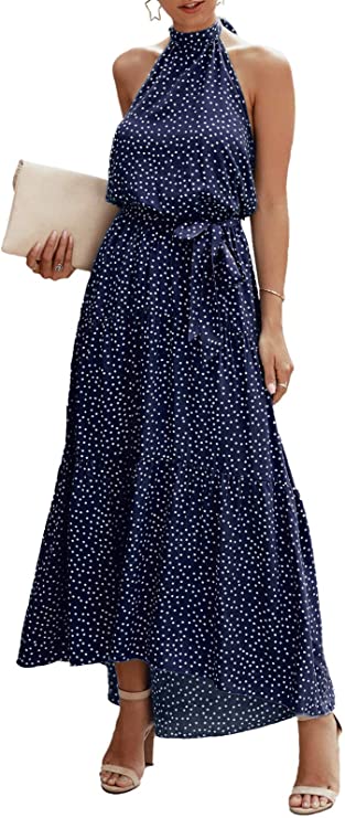 • *Unique Design:Halter Neck,Sleeveless,Polka Dot Print,Backless,Adjustable Strap,Ruffle Hem,Lightweight,Loose Fit,Full Length,High Elastic Waist,Belted,Tie Back,A Line Swing Dress,Floral Maxi Beach Dresses,Long Summer Dress,Pull on Closure.