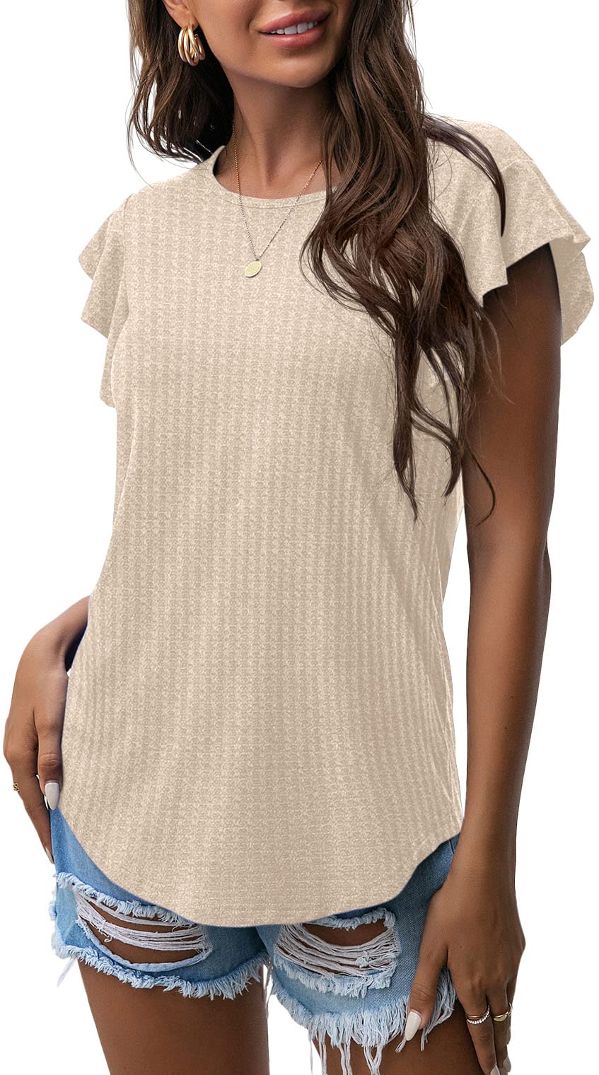 • Features: Waffle Knit, Ruffle Short Sleeves, Round Neck, Smooth Hem Detail, Solid Color, Loose Fitting, Fashion Simple Design. Show your own style and fashion temperament.