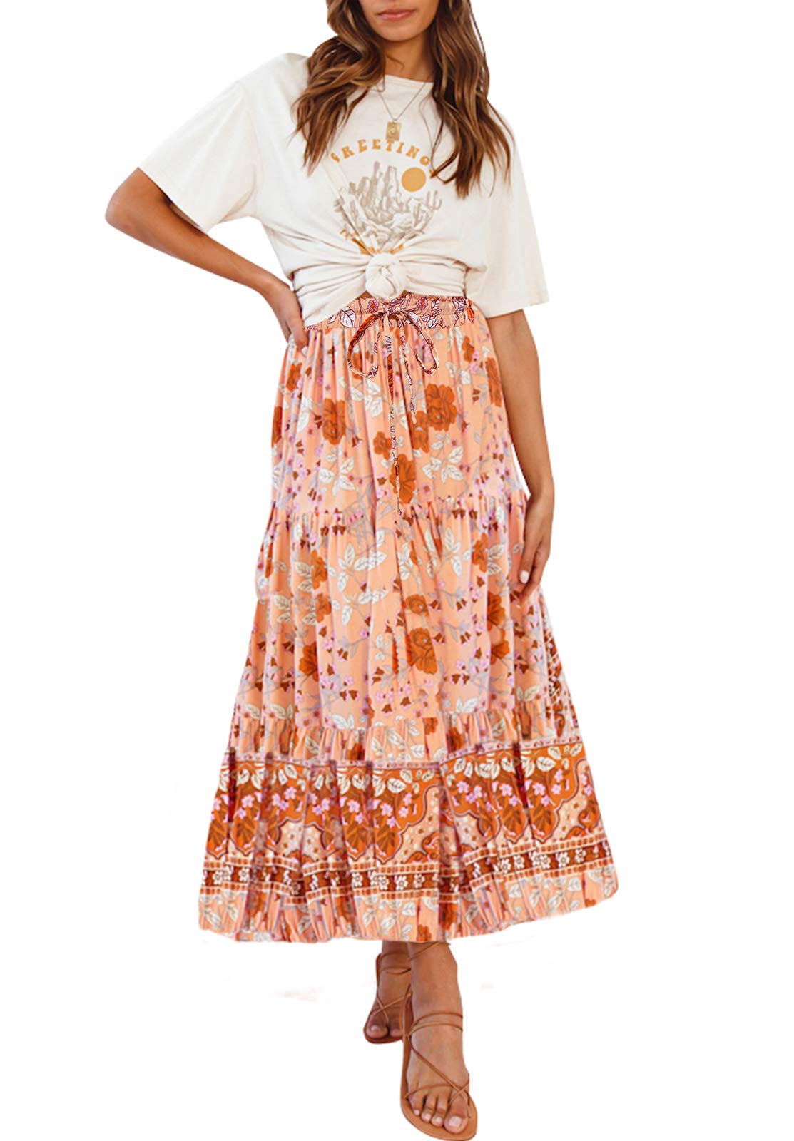 Peach Women's Bohemian Floral Printed Elastic Waist A Line Maxi Skirt with Pockets - ZESICA