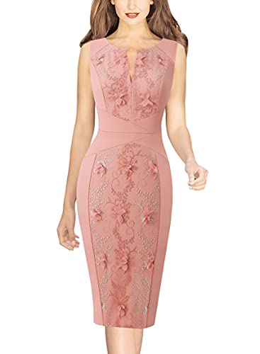 Plain Pink Plus Floral Embroidery Womens Front Zipper Slim Work Office Business Cocktail Party Pencil Dress Vfshow