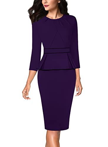 Purple With Black Piping Womens Pleated Crew Neck Peplum Wear To Work Office Sheath Dress Vfshow