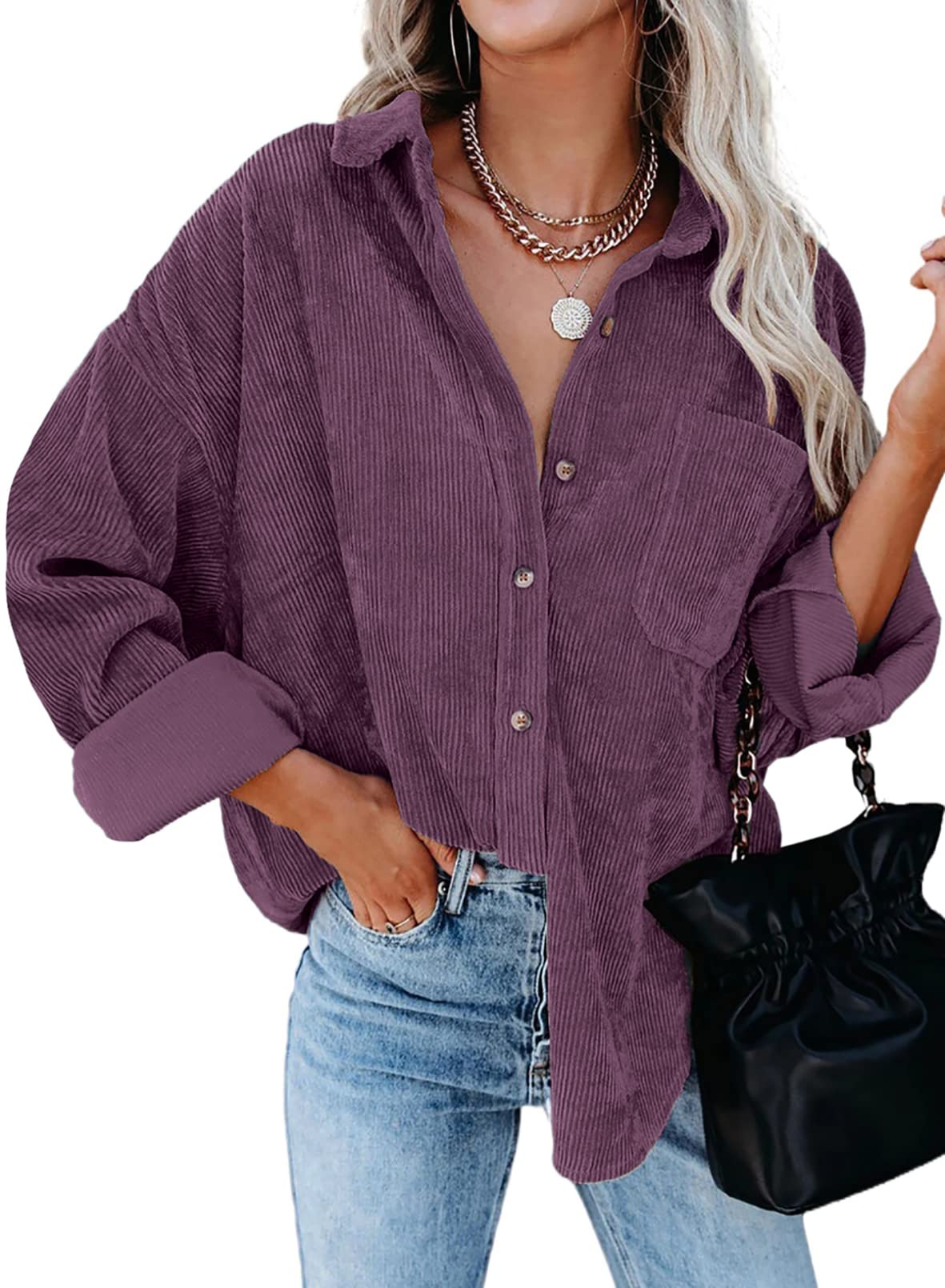 Purple Womens Corduroy Button Down Shirts Boyfriend Long Sleeve Oversized Blouses Tops - Dokotoo