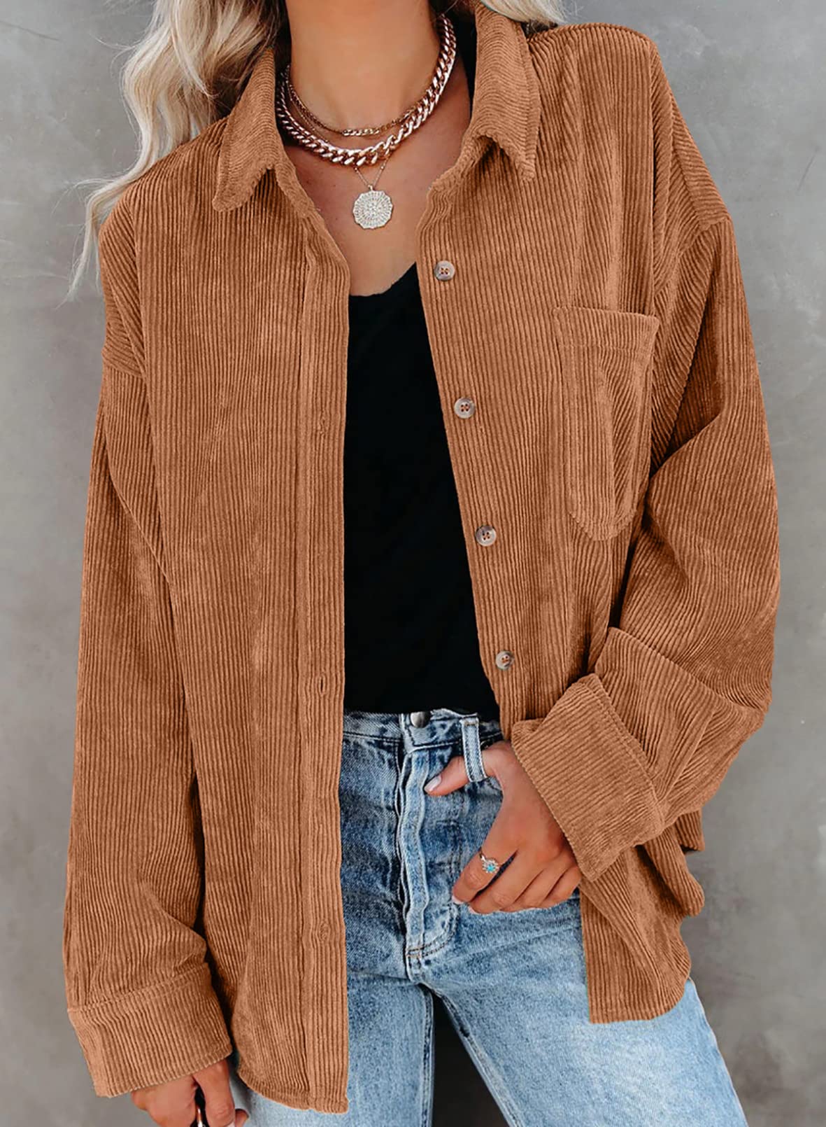 • Feature: Corduroy Fabrication, Solid Color, Front Button Closures, Bust Pocket, Long Sleeves with Button Cuffs, Boyfriend Style, Turn-Down Collar, Loose Fit Shirts. It can be tied at the waist or wrapped around waist, wear as 3/4 sleeves or full sleeve