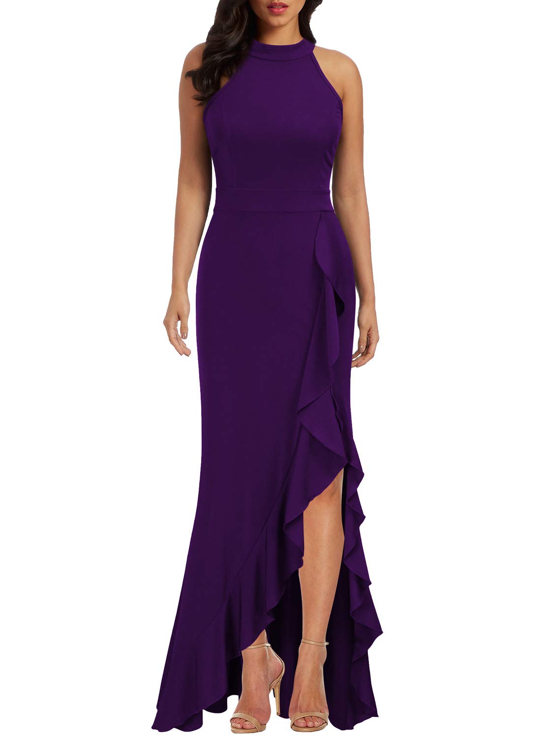 Purple Women's High Neck Split Bodycon Mermaid Evening Cocktail Long Dress - WOOSEA