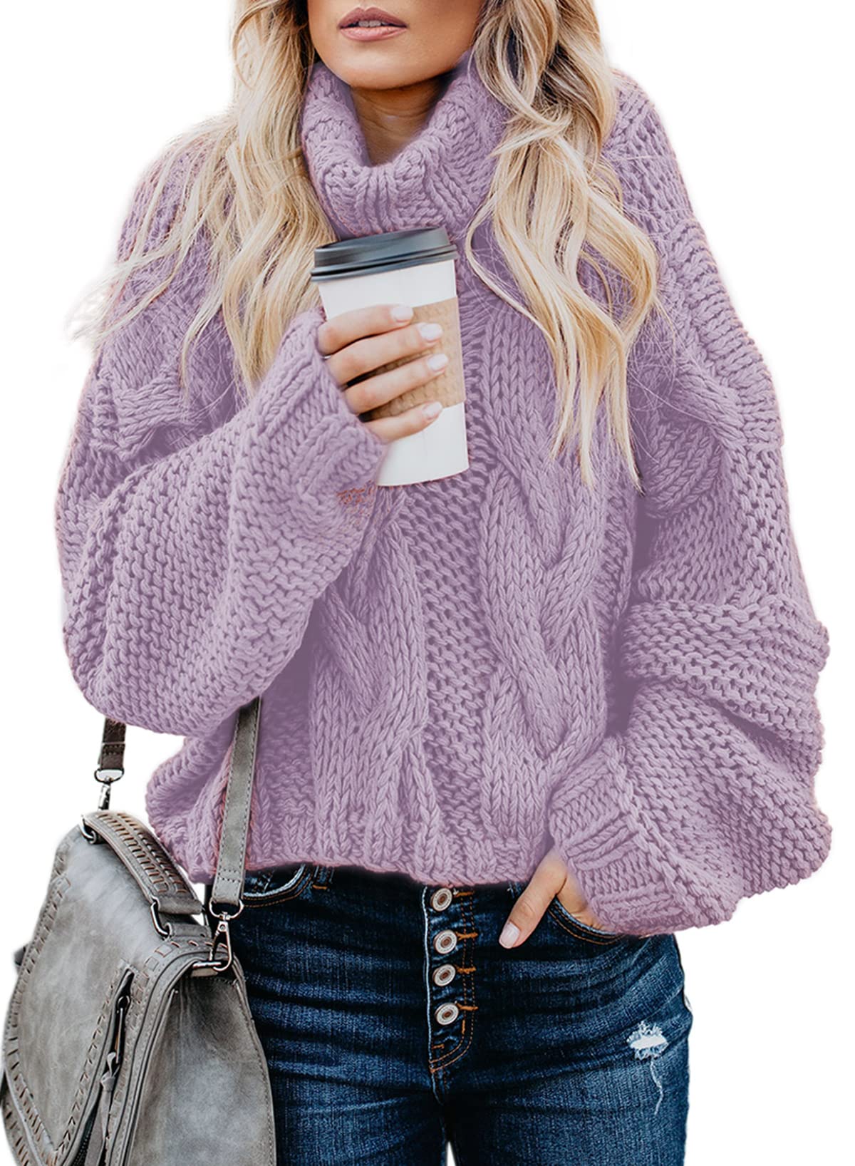 Purple Women's Turtleneck Balloon Long Sleeve Casual Loose Chunky Cable Knit Pullover Sweater Outerwear - FARYSAYS