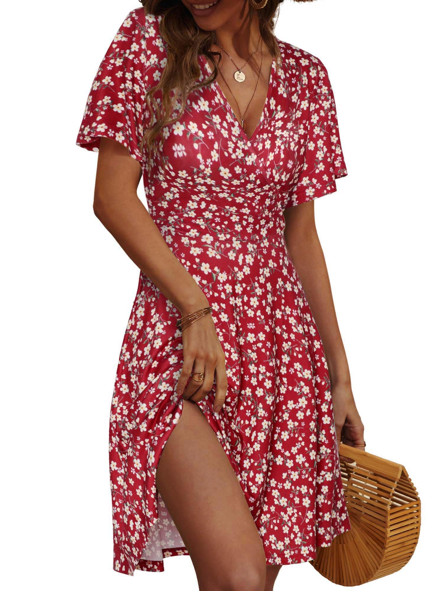 Red A-Line Midi Dress Sundress Summer Floral Short Sleeve - FENSACE | – Original Brand