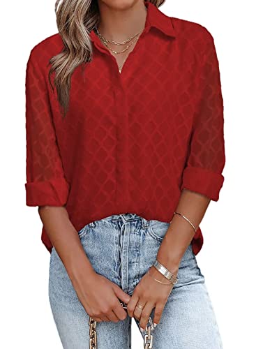 Red Sleeve Womens Button Down Shirts Long Sleeve V Neck Blouses Tops for Work - FARYSAYS