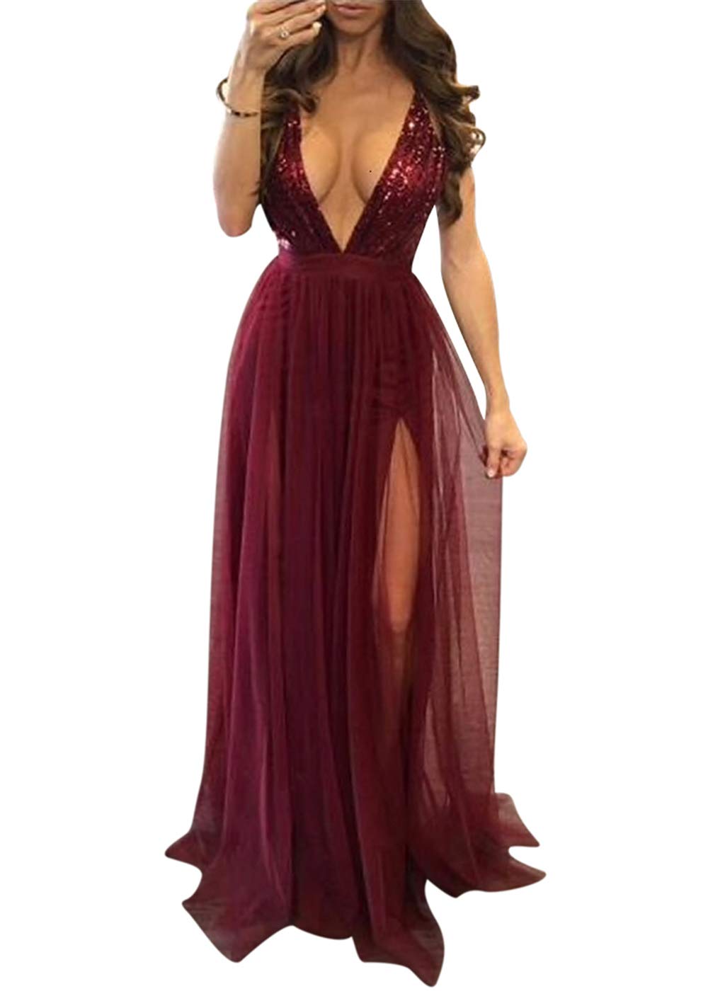 Red Wine Sleeveless Women's Solid Mesh Spaghetti Strap Sequin Cross Back Elegant Evening Party Dress - Fuedage