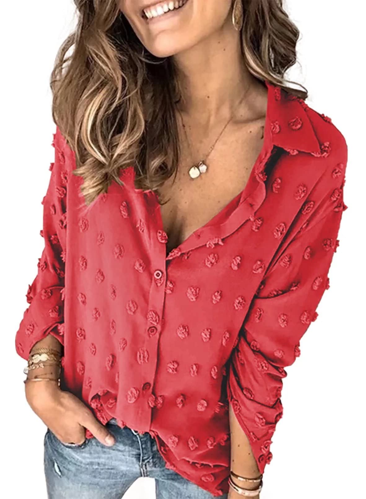 Red Women Pompom Button Down Shirt Casual Blouse Top - Astylish