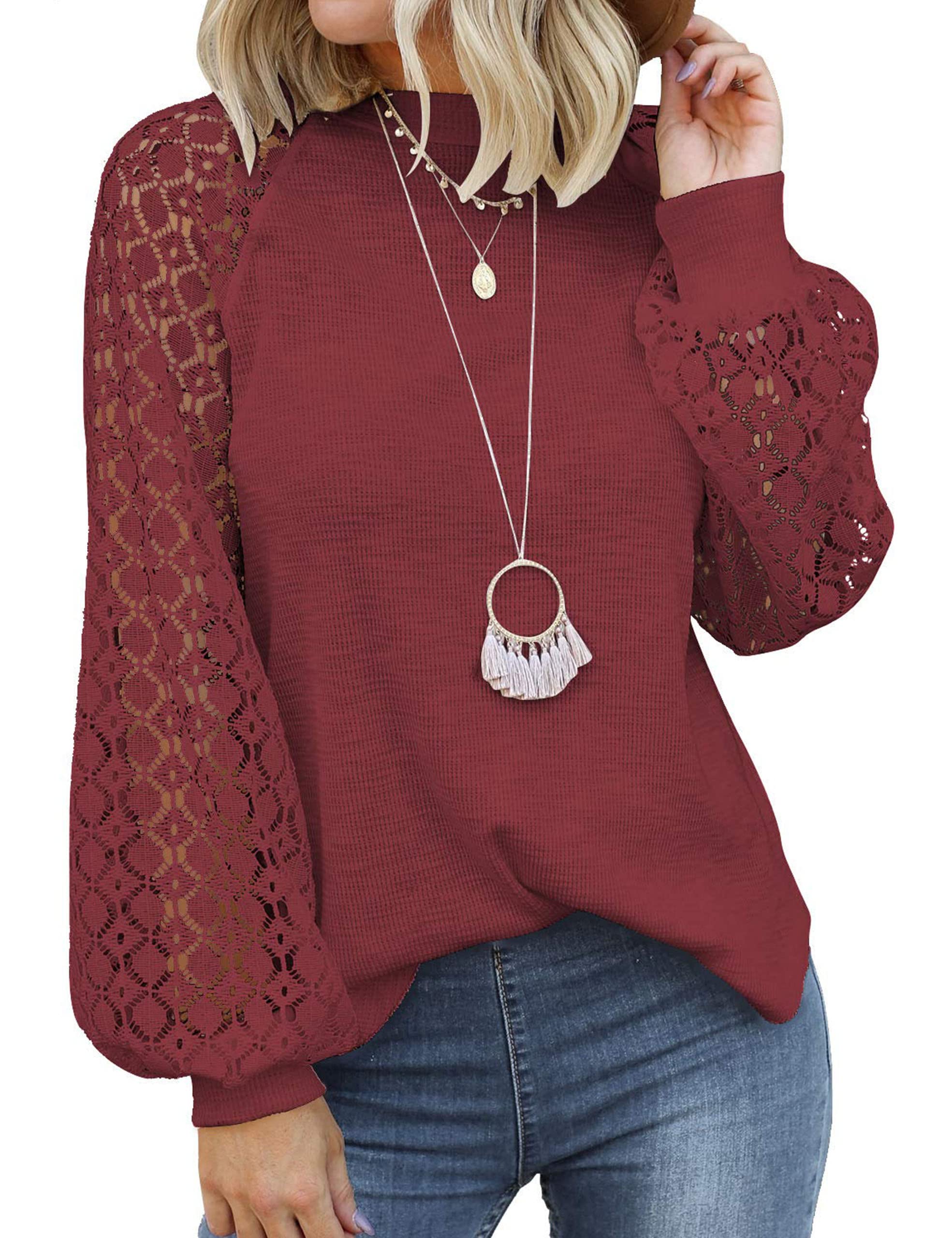 Red Women’s Long Sleeve Tops Lace Casual Loose Blouses T Shirts - MIHOLL